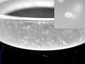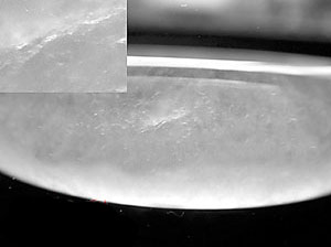 玻璃种:致密微晶结构,微晶部分不可分辨,透明度好,棉质与结构清晰分明。