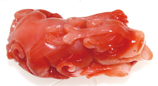 “吉尔森珊瑚”:使用方解石粉末加上少量的染色剂在高温高压下压制而成,不具有珊瑚的特殊结构,呈微粒状结构,手掂较轻。