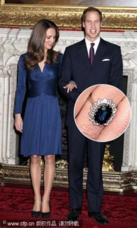 婚戒指是公主式的,威廉王子送给她一个18克拉的蓝宝石和白钻尤物(仅由他的母亲戴安娜所有)。