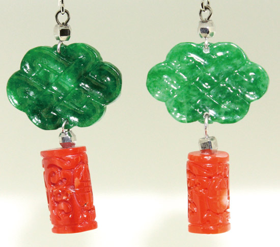 运用砂丁料制作的红珊瑚耳饰,与翡翠搭配,对比强烈