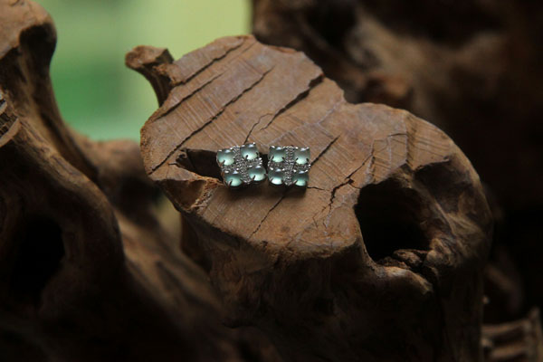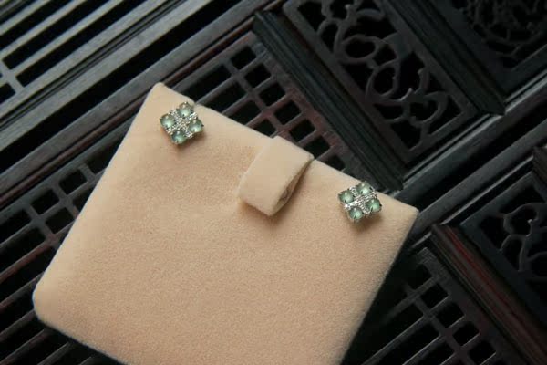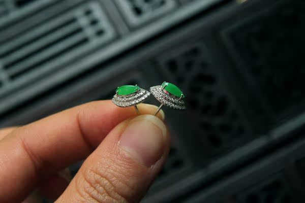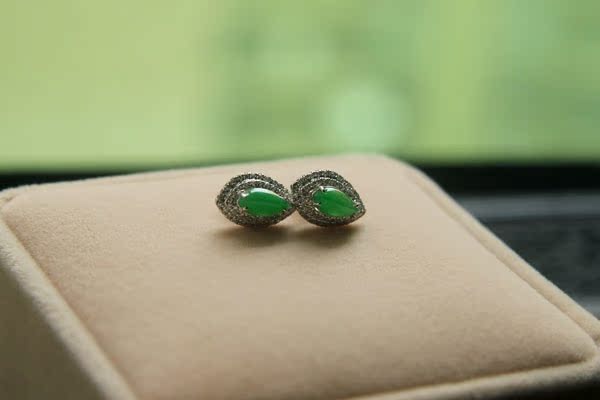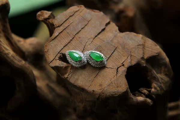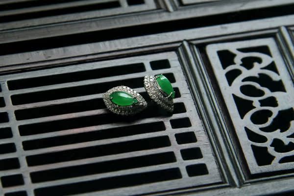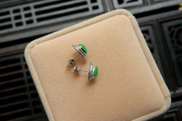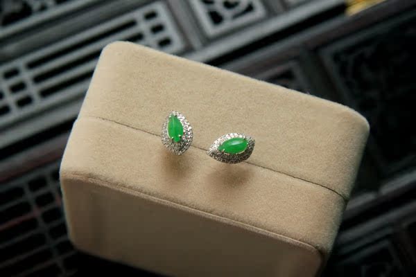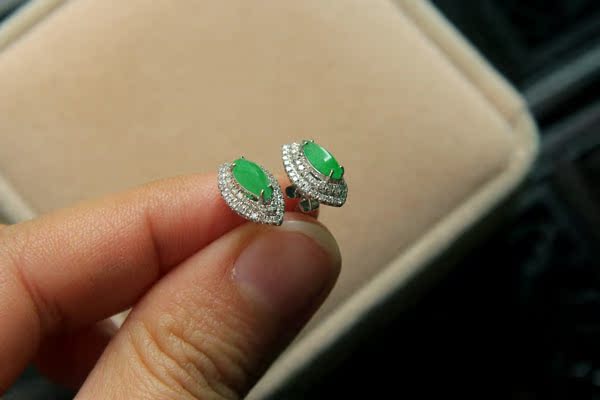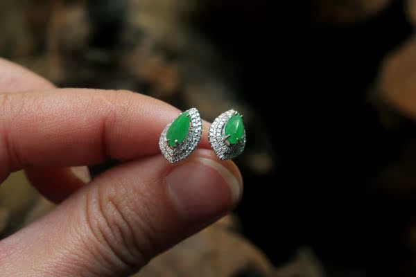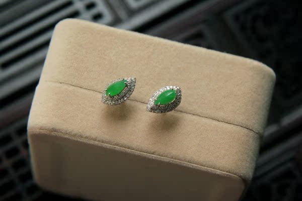 18K白金钻石阳绿翡翠随形耳钉 5300元