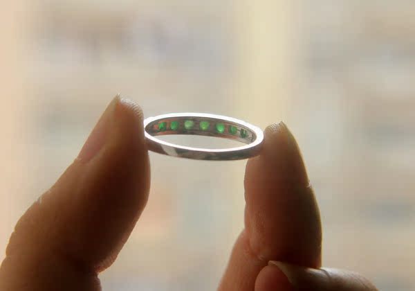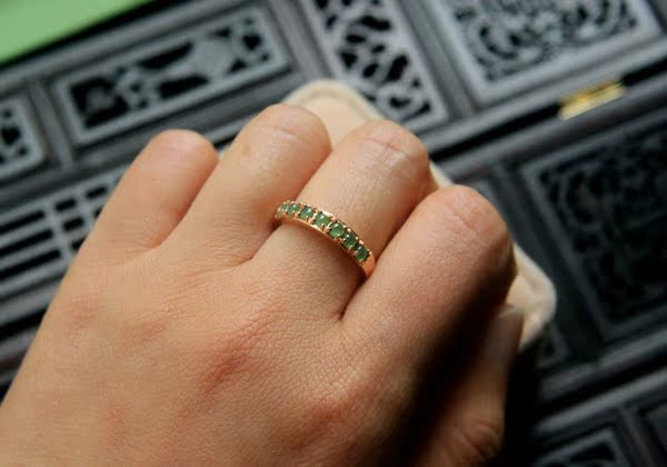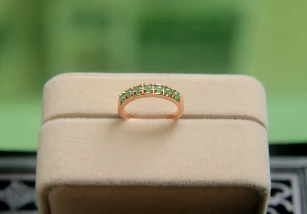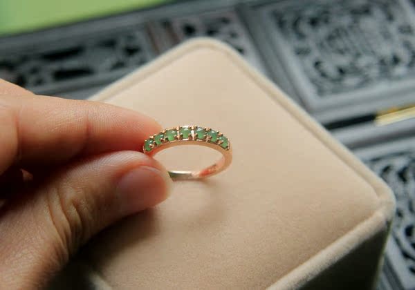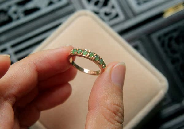 925银镀玫瑰金甜绿翡翠小蛋排戒指,冰种甜绿色,蛋面颜色比较一致,种水都不错,透光个别有纹,无大碍,款式经典,佩戴效果很好!