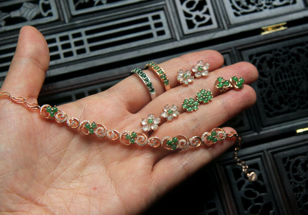 925银镀玫瑰金镶嵌,冰种绿蛋小白蛋,种水都很好,色甜,颜色均匀,个别有棉纹,无大碍,镶嵌款式大方经典,佩戴效果非常漂亮,性价比很高!