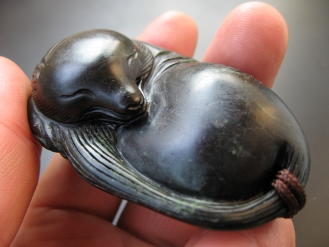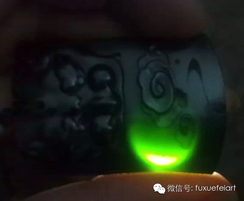 黑卡瓦又名新疆岫玉成分是蛇纹石玉,一般新手容易误认为是黑碧玉玉,上手手感轻飘,较干涩。黑卡瓦比上面的卡瓦硬度想对较高,硬度能达六,可以画动玻璃。黑卡瓦一般都透绿光,进光光圈较小内涵无不规则,内涵成团绪状较大,进光光圈不均匀。【黑碧玉进光较好,光圈均匀,内涵物呈点片状黑点较小】有些黑卡瓦是玩全不进光新疆人美名为墨宝。新手在看不出来的情况下最好借助强光手电筒看进光很内涵物