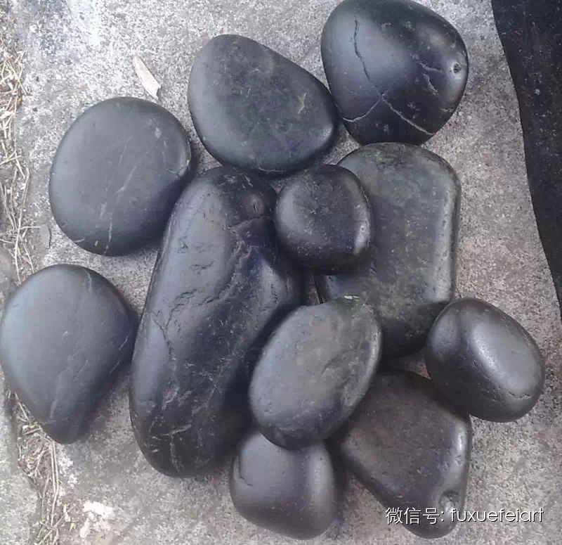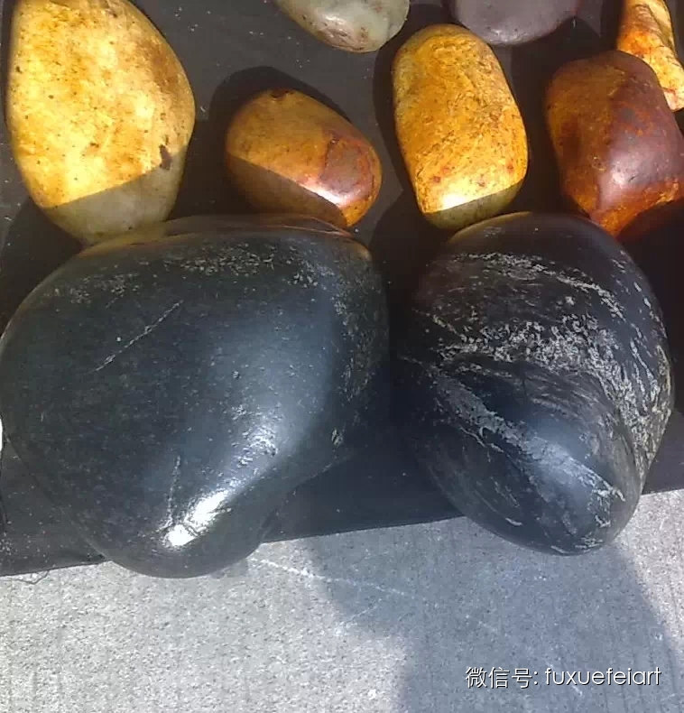 这两个大的黑卡瓦就是市面上见到的黑卡瓦手镯和手链成品的生产原料。去鉴定他也是蛇纹石玉,而且还是产自新疆玉龙喀什河的。是陪伴着和田玉籽料一同成长的邻居呵呵