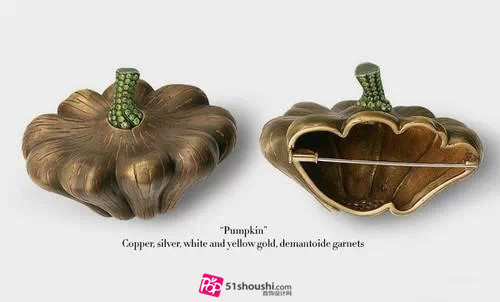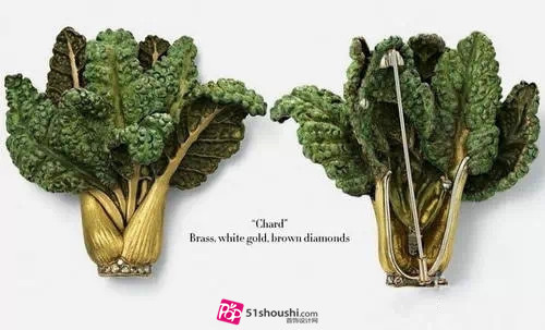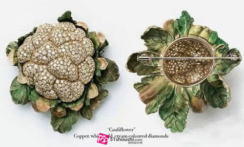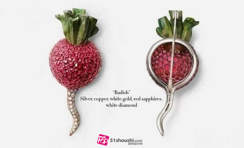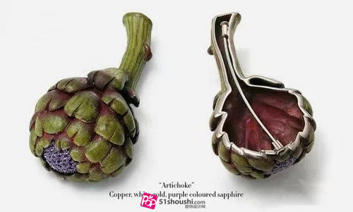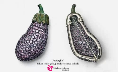 钻石点缀镶嵌的茄子造型精致耀眼、观察非常细致的设计师将洋葱的外皮非常逼真、将长长的柿子椒变成小巧短粗的造型,别有一番“风味”尽在其中。