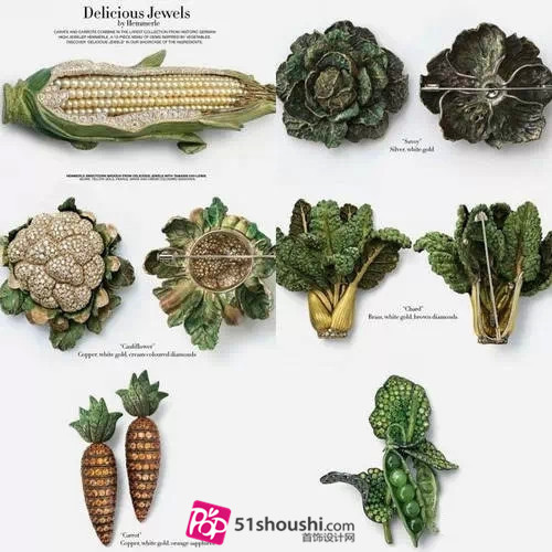 蔬菜搭配珠宝为时尚首饰设计增添带来低调奢华风,玉米造型、个性花菜、可爱豌豆造型为本季时尚首饰设计增添创意个性魅力,本期【51首饰设计网】将为大家带来时尚创意首饰造型展示——欢乐农场。