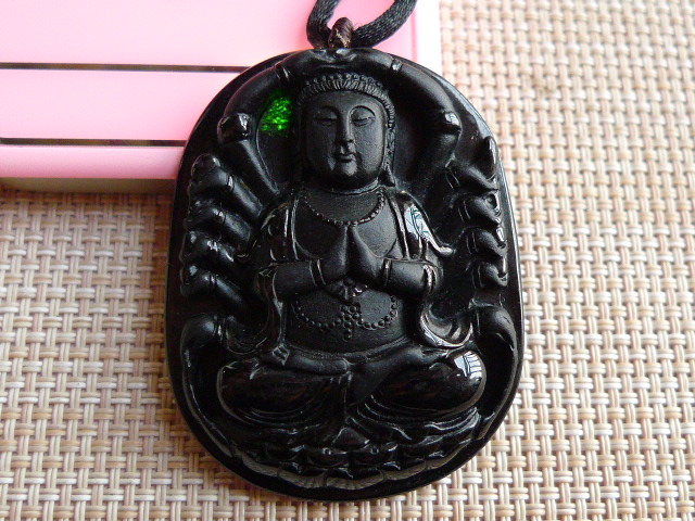 【名称】-天然缅甸翡翠a货一口价老坑冰糯种极黑透光墨翠千手观音吊坠批发 送证书6124