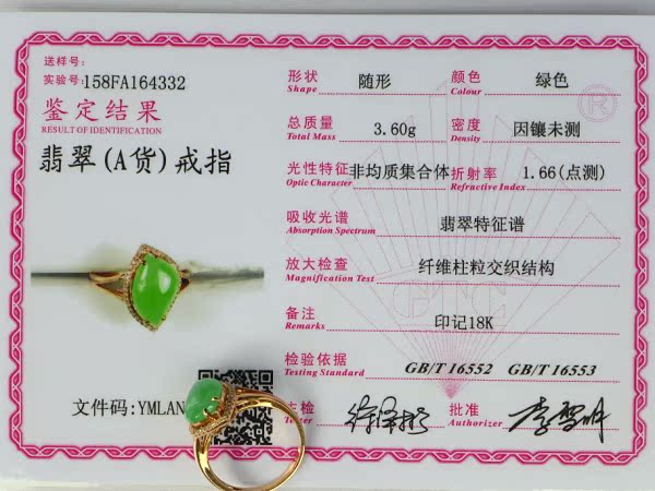 【翡翠尺寸】:内径:17mm。总体长:25.3mm。宽:21.1mm。厚:16.5mm。裸石尺寸:长:13.5mm。宽:8.4mm。厚:5.5mm(分别取最大值,可能有轻微误差)