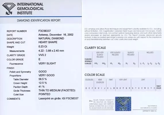 这个秘密你要知道:IGI证书对于切工信息的描述极为精准,在Finish项下还细分了Symmetry(对称性)、Polish(抛光)、Proportion(比例)等三个部分的比例描述,对钻石底尖、腰部等细节描述也很到位。