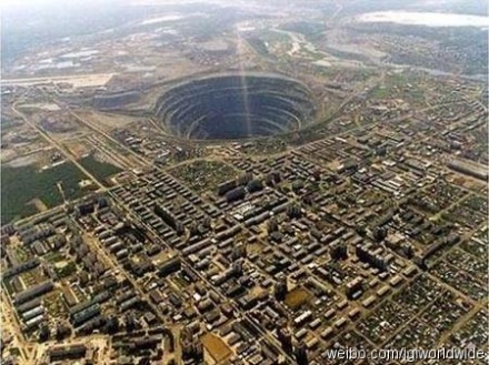 钻石矿坑之一。讽刺的是,虽然它的俄语名为“默尼”,意思为“和平”,可是当时该矿的主要收入却为前苏联冷战提供了大笔军费。要想在这片如岩石般坚硬的冻土层上开采出