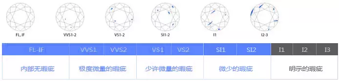 钻石4c:净度(Clarity) 钻石的净度通常使用10倍放大镜对钻石内部、表面瑕疵及其对光彩影响程度对未镶嵌钻石的净度级别进行分级,按GIA的标准细分为LC、VVS1、VVS2、VS1、VS2、SI1、SI2、P1、P2、P3共10个级别。柏瑞钻石均采用SI级以上的高净度钻石,某些商家一味追求价格低廉而采用的P级钻又称为I级钻,一般不作为宝石用钻,没有首饰价值。所以一般只分到P级,不再分P1\P2\P3。