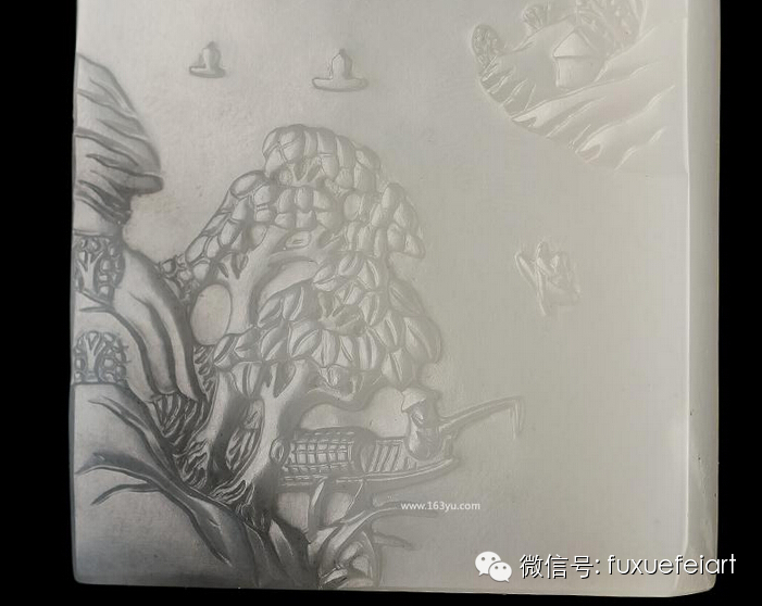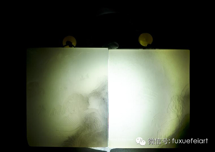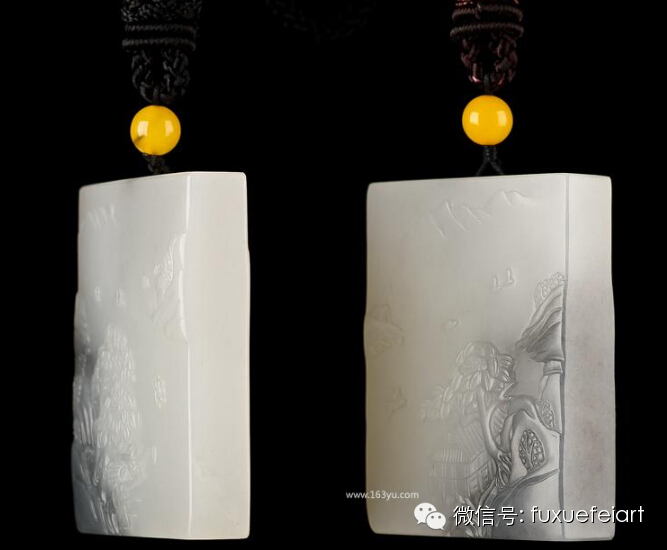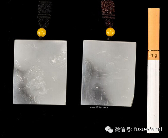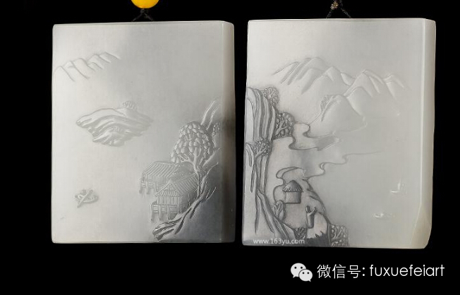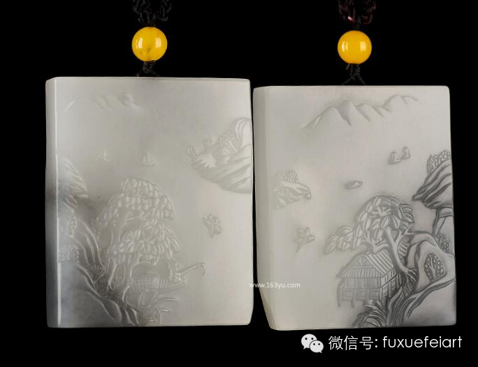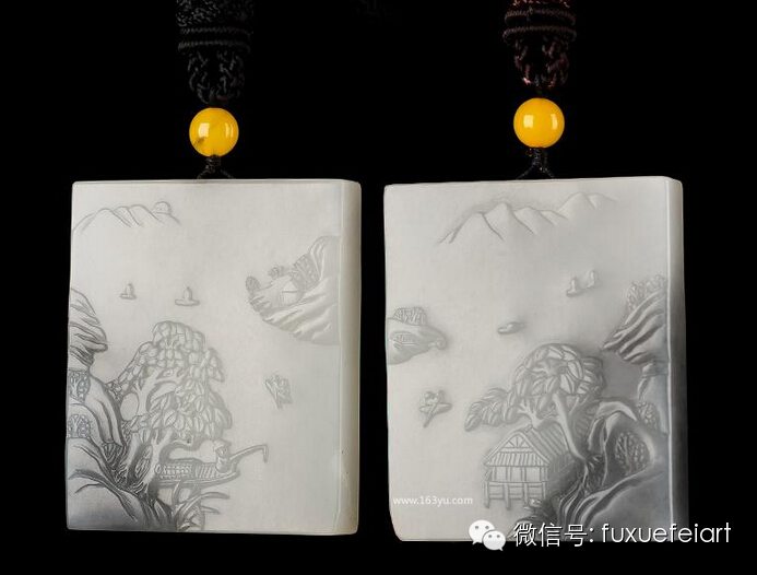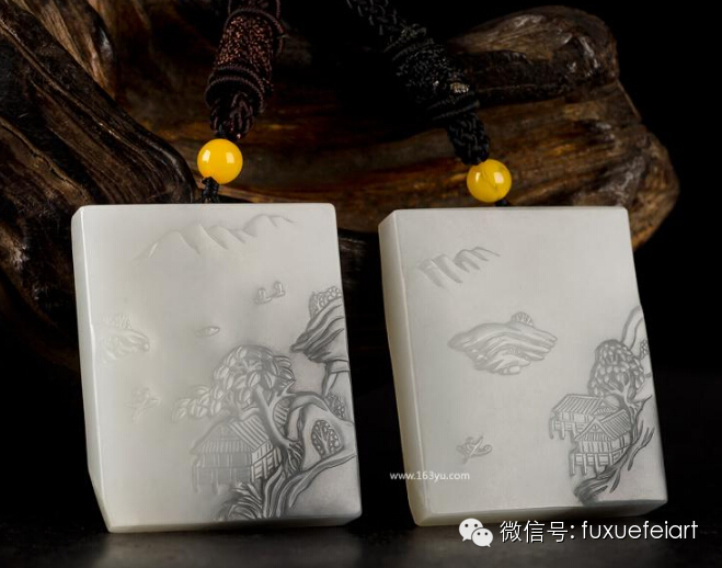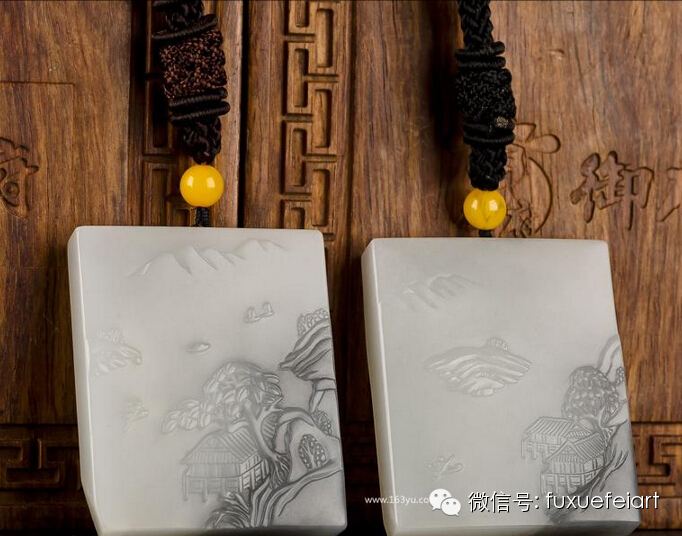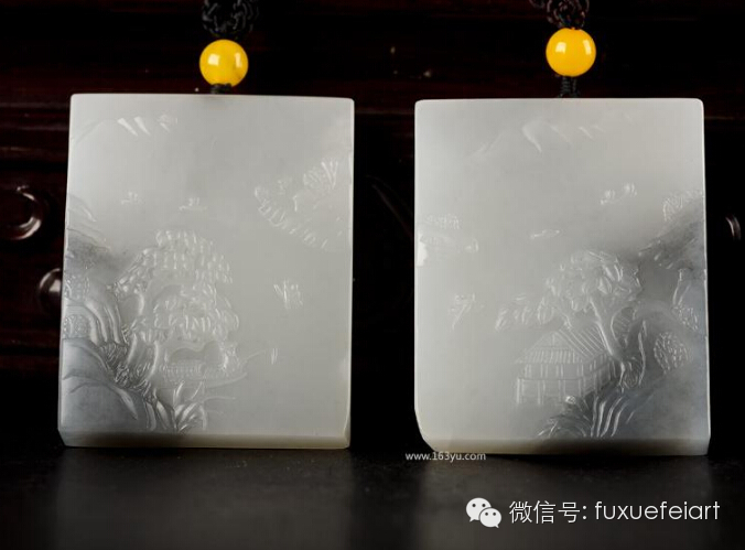 两块青花籽料精雕而成,两对牌牌型相似,墨色沁染两相呼应,可见选料者的用心之深。对牌牌面皆雕江南风景,淡淡的墨色渲染,勾勒出江南山水中独有的那一份烟雨朦胧之美。