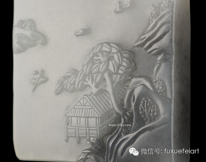 布局层次分明,远处高山隐隐,云遮雾绕,近旁小桥人家,绿树成荫,渔家归舟。整体透出“似水含烟,醉墨江南”的清新素雅,别有一番婉约情致,令人过目不忘。