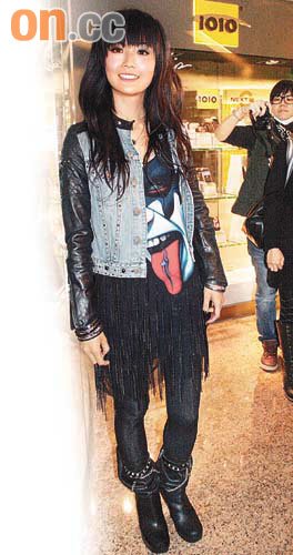 蔡卓妍以黑色为主打,牛仔外套和短靴均镶上窝钉,两手也戴满银器,并配上bob头、黑眼线和黑指甲,摇滚Rock味十足。问到绯闻男友郑中基可有到场?她说:“他有工作不在香港嘛。(生日愿望?)身体健康。”