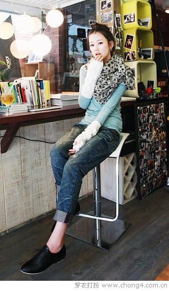 04 素净的长袖上衣搭配牛仔裤充满了街头味道,挽起的牛仔裤看起来更有潮味了,全身的搭配中最抢眼的莫过与那条黑色×灰色的星星图案围巾了,围巾搭配起来很有美感,层叠的围巾渐高渐低的,很有重点,非常迷人!