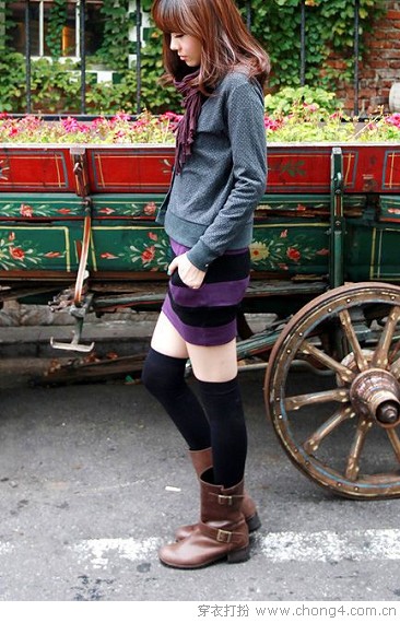 06 紫色×黑色的条纹连衣裙剪裁贴身,把各位潮女的身体曲线完美地勾勒出来,外搭轻薄外套以及围上一条围巾会让你看起来更有魅力哦~