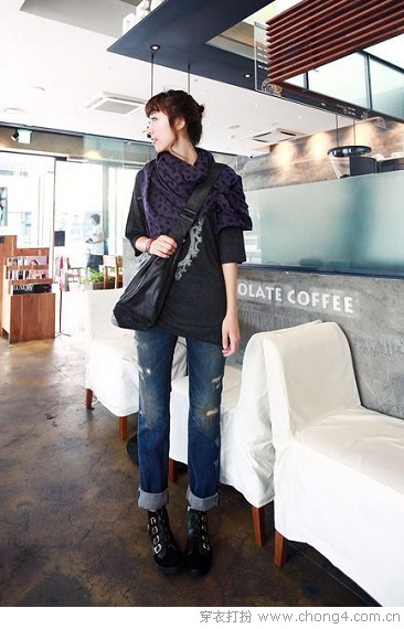 05 宽松上衣搭配挽脚牛仔裤的搭配潮味十足,从今年初春开始从西方开始流行的破洞牛仔裤在现在来看仍然人气高涨,充满破坏feel的牛仔裤让你的搭配更具有吸引力,黑色×紫色的星星图案围巾弄成三角形般的样子,让人感觉很可爱哦!