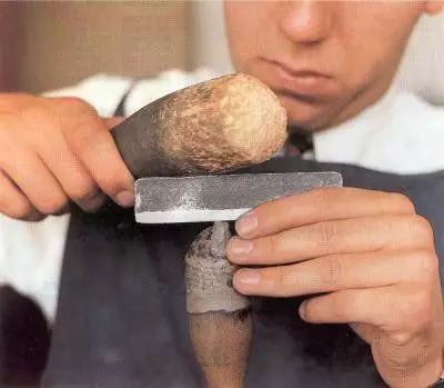 钻石毛坯一劈为二。要做的是在毛坯上开出一道槽口,再将一块刚片置于槽口内,随后给予刚片干脆的一击,毛坯就势分为两块。这样做的目的是使毛坯获得适于锯切或粗磨的外形,同时消除裂纹和杂质等影响