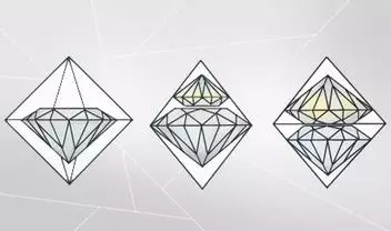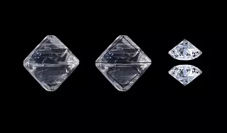 钻石原石经没汁、分割(劈钻、锯钻)、车钻、磨(抛)等工艺转变成一定琢型的成品