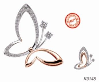 专利款 蝶恋 蝶恋,精细别致的群镶工艺,远看像群星绽放光彩,晶莹璀璨,彩金白金交相辉映,时尚双色的蝴蝶造型,绽放出女性的浪漫情怀,经典的四爪镶美钻点缀其间,让晶莹的蝴蝶更加的灵动。戴上它,犹如在云端上翩然起舞,跟随着心灵指引的方向,飞向幸福的彼端。一款产品,两种戴法,款式的灵感来自于女性不同场合里对不同饰品的需要,力求从设计的角度去满足女人的多个愿望,让您成为时尚多变的炫彩女王!